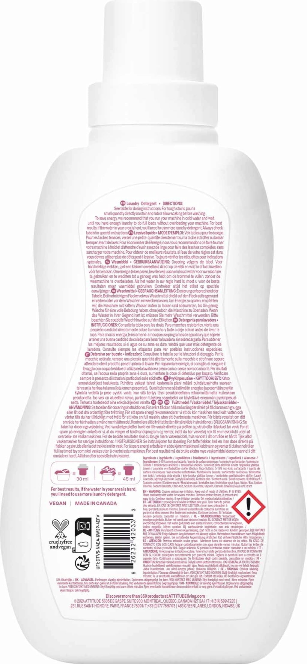 Este detergente líquido sin perfume de ATTITUDE ha sido especialmente diseñado para limpiar la ropa delicada de los niños. Muy eficaz en manchas difíciles de tratar como gelatina o rotuladores, el detergente también es adecuado para lavar pañales de tela, mantas, baberos y peleles.