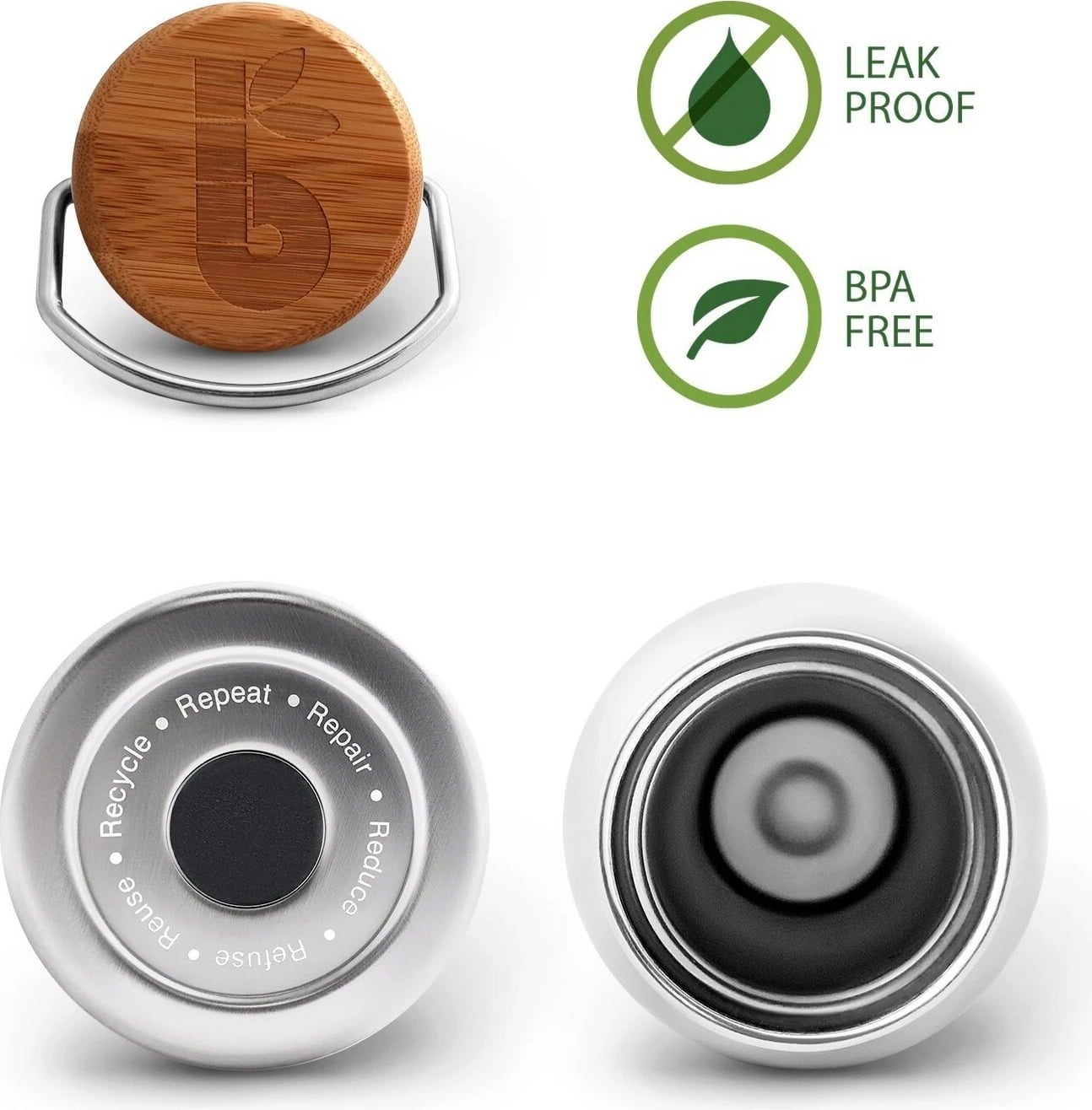 Este termo de acero inoxidable es el compañero perfecto durante todo el año. En los calurosos días de verano, la botella mantiene las bebidas frías hasta 24 horas y calientes hasta 12 horas en invierno. La botella está sellada con una tapa de bambú y la abertura es lo bastante grande para contener cubitos de hielo, huevos de té o fruta. Cuando la botella está vacía, se puede limpiar fácilmente con un cepillo para botellas. Además, es segura para la salud y no contiene BPA, por lo que ninguna sustancia química tóxica puede llegar a tus bebidas.
