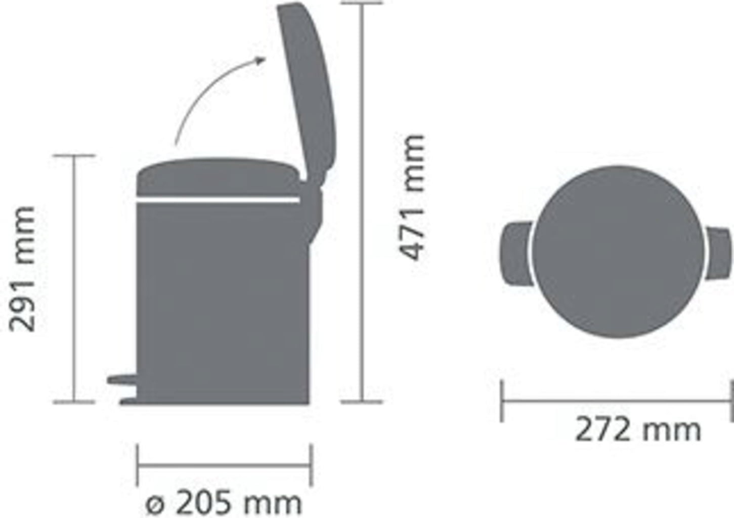 - Profundidad (incl. pedal): 27,2 cm, diámetro: 20,5 cm, altura: 29,1 cm.