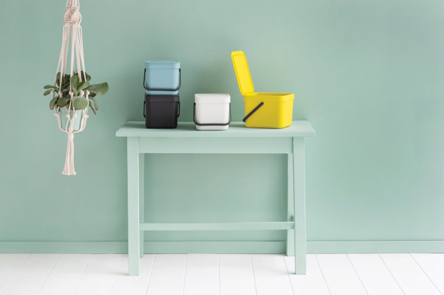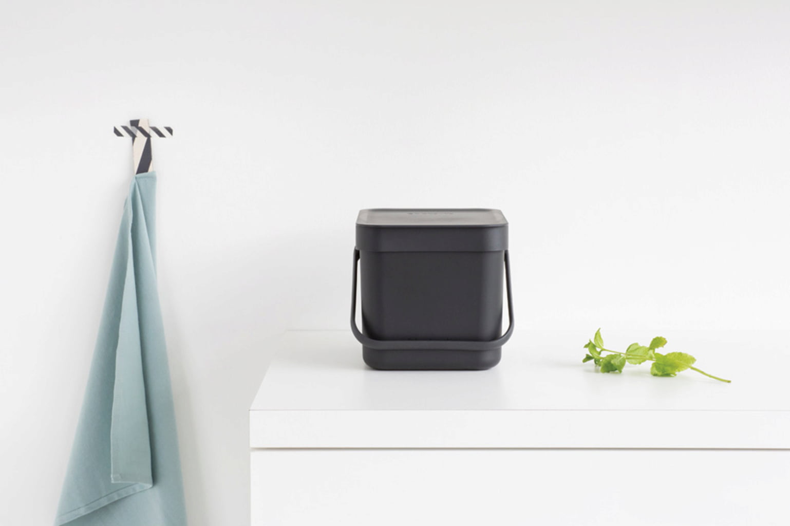 Este pequeño cubo de basura es ideal para los residuos compostables. Se puede colocar en cualquier lugar de forma independiente o adosarlo a la pared.