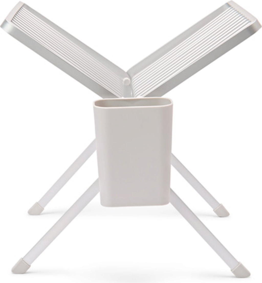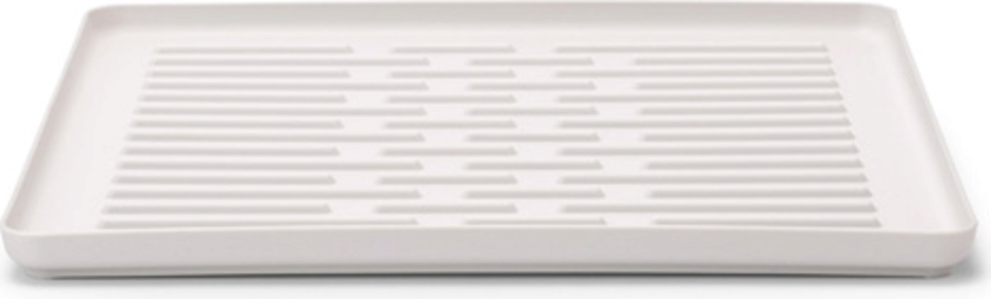 Este práctico escurridor de platos fabricado en aluminio presenta un diseño funcional y único. El accesorio, con una base de plástico ranurada y una bandeja para cubiertos extraíble, ofrece espacio para hasta 13 platos y también puede acomodar ollas y sartenes. La base estriada se puede utilizar en combinación con la tapa o por separado. Gracias a la ligera pendiente de la base, el agua puede fluir directamente al fregadero, sin crear estancamiento.