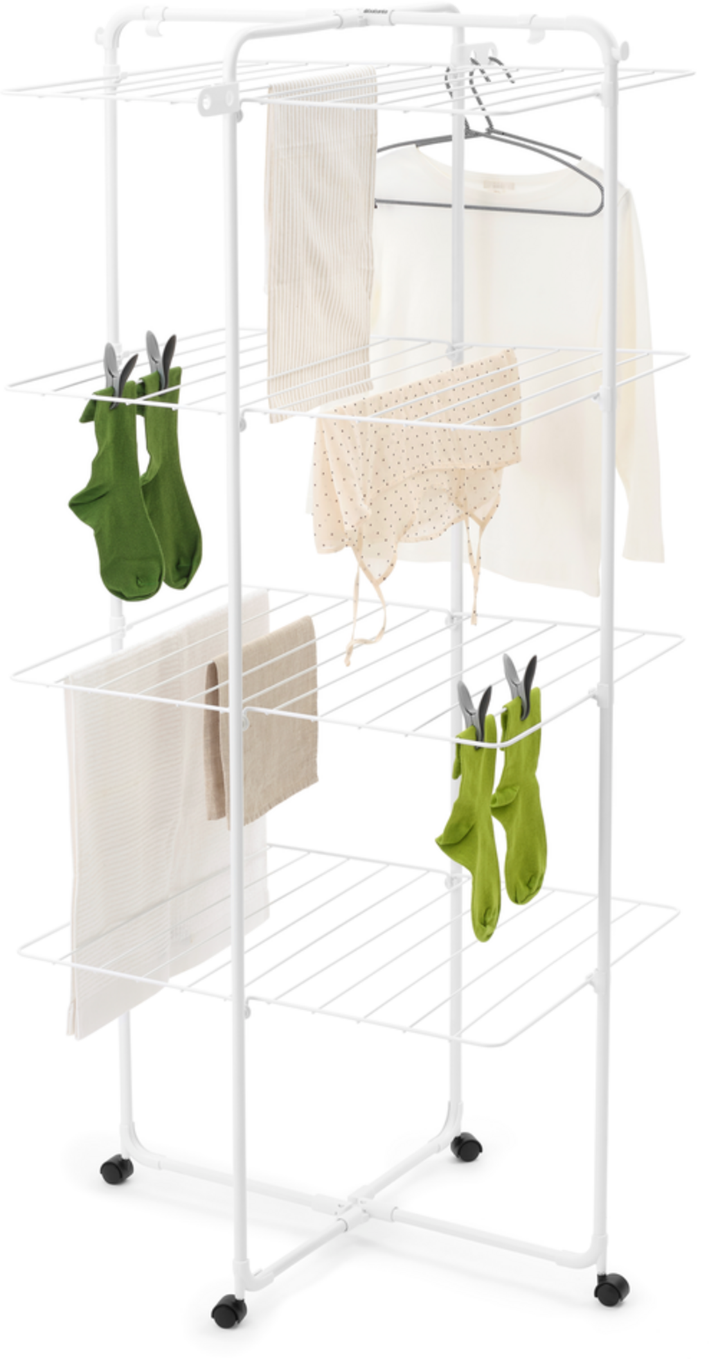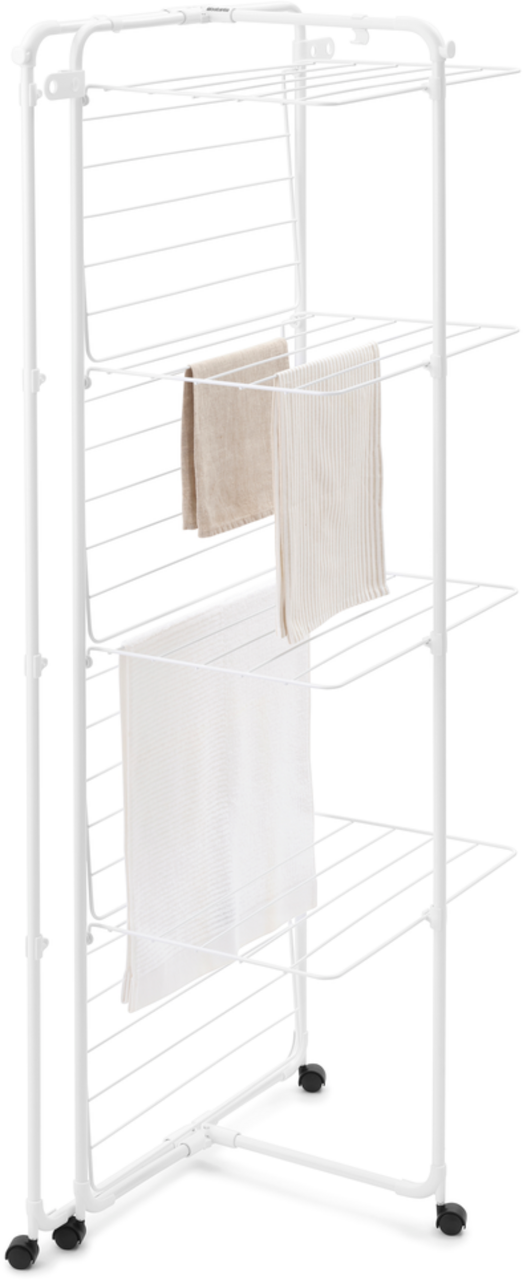 El tendedero vertical HangOn ofrece un amplio espacio de secado ocupando poco espacio. Con una capacidad de 30 metros, es ideal para grandes cargas de ropa y, gracias a su ingenioso diseño con ruedas, puede trasladarse fácilmente a cualquier rincón. Su robusta estructura de acero hace de este tendedero un complemento duradero y elegante para cualquier cocina, cuarto de baño, dormitorio o salón.