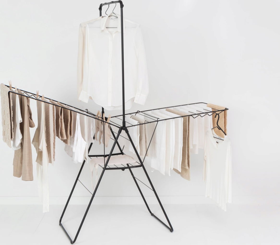 Funcionalidad inteligente: se pueden secar hasta 18 blusas o camisas en el riel para ropa y los ocho ganchos en los brazos laterales.