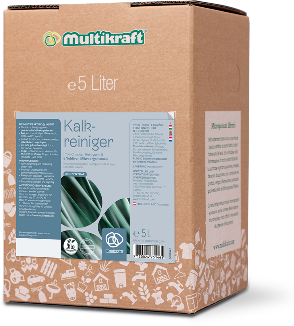 El limpiador antical eMC es muy rentable en su uso y debe su eficacia contra la cal al efecto natural del ácido cítrico y las bacterias probióticas, que eliminan fácilmente los depósitos de cal y garantizan una limpieza radiante. Además, los microorganismos efectivos vuelven a activarse si se vuelve a ensuciar, por lo que la limpieza dura más tiempo.