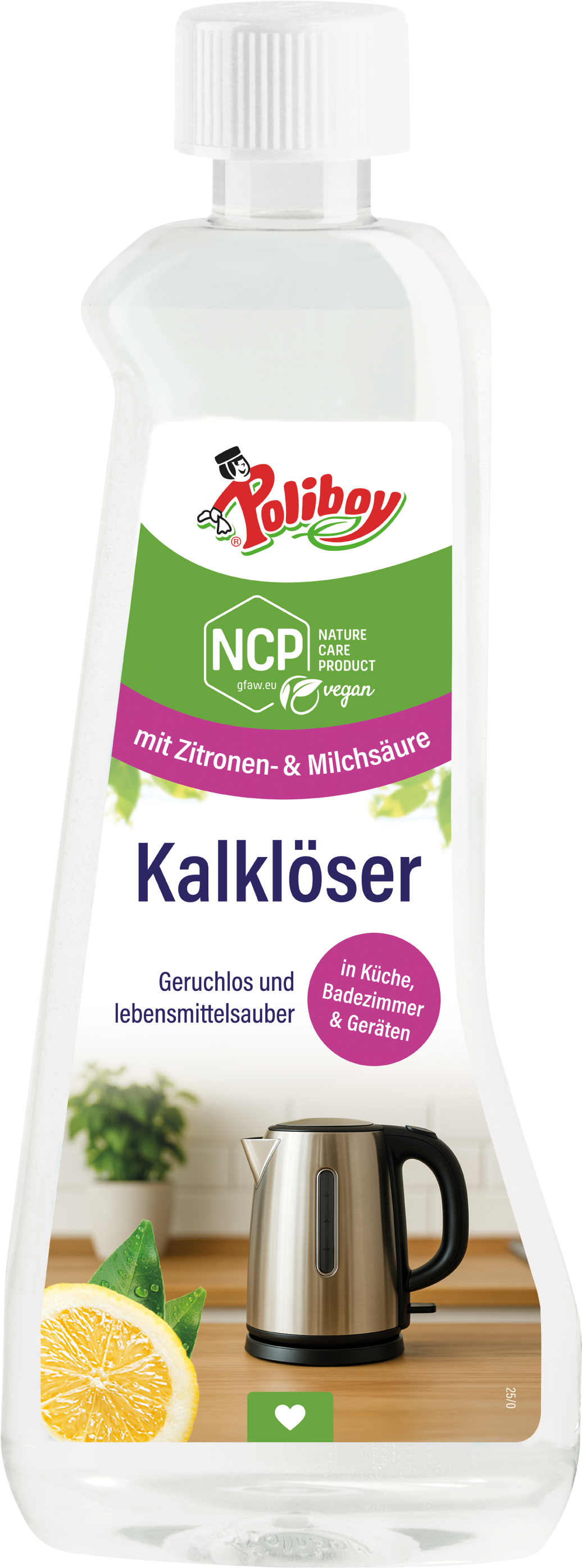 Perfecto para eliminar la cal de superficies y electrodomésticos, el limpiador contiene principios activos naturales, además de ácido cítrico y ácido láctico. Usado puro, el limpiador elimina la cal de las paredes de la ducha, los azulejos y los grifos, mientras que diluido se puede usar para desincrustar electrodomésticos.