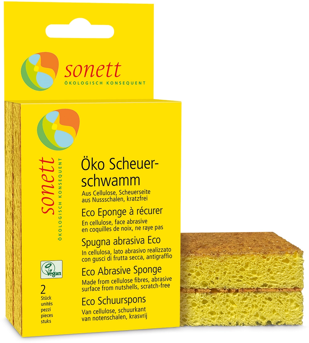 La esponja abrasiva antiarañazos de Sonett está fabricada con el mayor porcentaje posible de materias primas biodegradables y se compone de fibras de celulosa. La cara abrasiva está recubierta de cáscaras de almendra y avellana molidas y elimina la suciedad del acero inoxidable, la cerámica, el cristal y la porcelana. La esponja puede lavarse a 60 °C y reutilizarse varias veces.