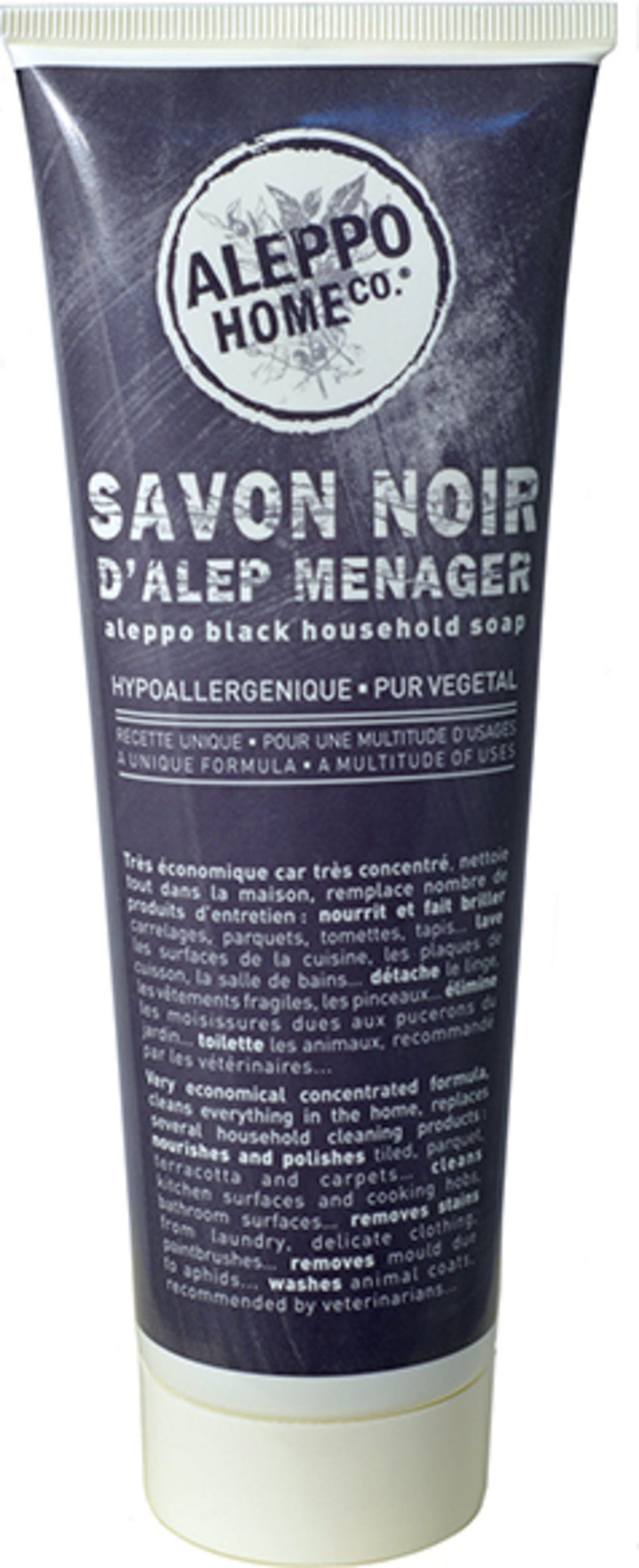 El verdadero jabón de Alepo negro se obtiene siguiendo una receta exclusiva con aceite de oliva y aceite de laurel. Altamente concentrado, el jabón es un verdadero todoterreno en el hogar, ya que tiene un efecto limpiador y abrillantador, mientras que la formulación es biodegradable e hipoalergénica. Dado que el producto es especialmente agradable para la piel y compatible con todo tipo de pieles, puede sustituir todos los limpiadores del hogar y el jardín.